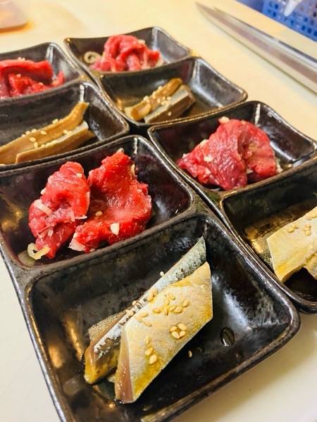 馬肉塩ユッケと〆新秋刀魚が お通し。
