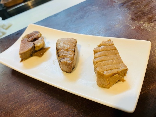 牛タン煮込み・中トロ炙り・マグロ角煮が お通し。