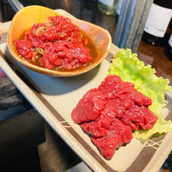 会津馬刺しと桜ユッケのハーフ&ハーフ。