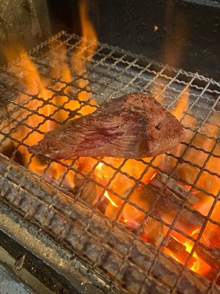 話は夕方開店時間前に飛びまして、馬肉のタタキを炭火で仕込みまして🔥