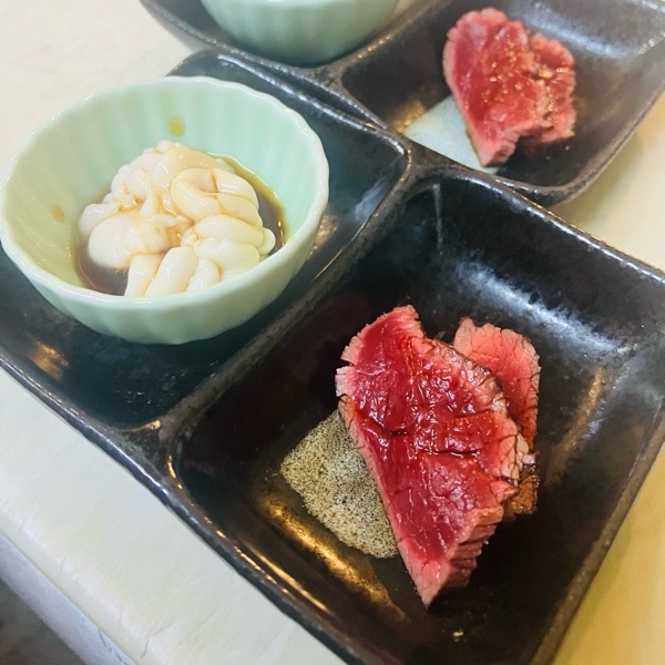 白子ポン酢と馬タタキが お通しで、開店٩( ᐛ )و