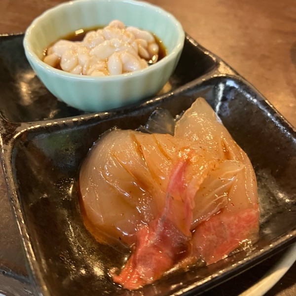 白子ポン酢と汐子のユッケが お通しでした。