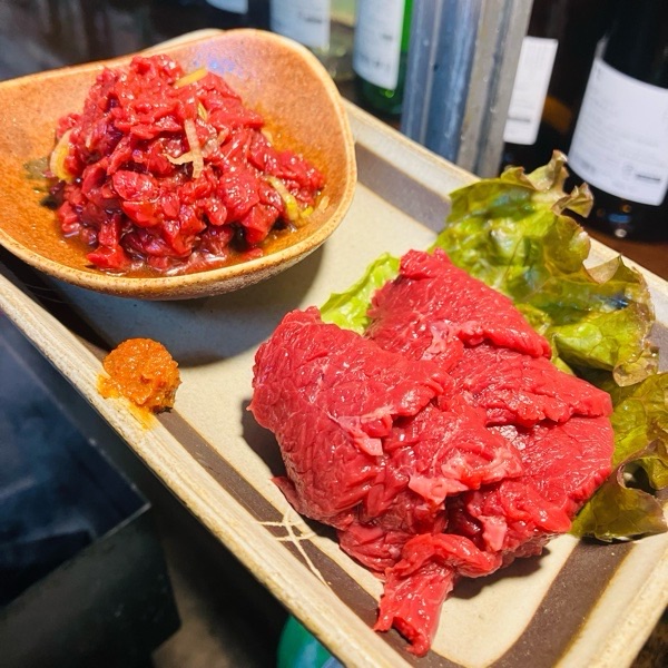 会津馬刺しと桜ユッケのハーフ&ハーフ。