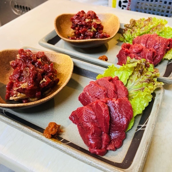 会津馬刺しと桜ユッケのハーフ&ハーフ。
