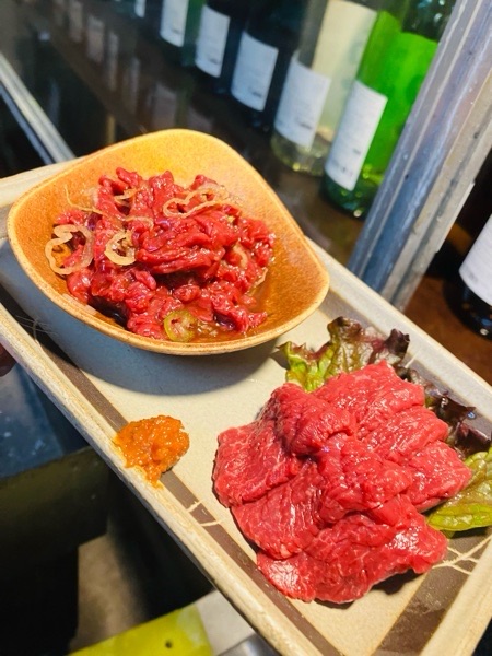 会津馬刺しと桜ユッケのハーフ&ハーフ。