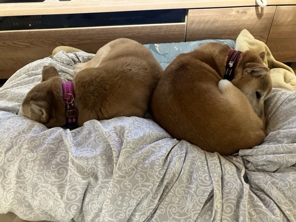 熟睡してから 起こすのも可哀想なので、晩酌タイム前に 布団を敷いてあげますと、どーもデース⤴️と みるく先生が やって来まして、ヒバ子さんと背中くっ付けて夢の中でございました💤