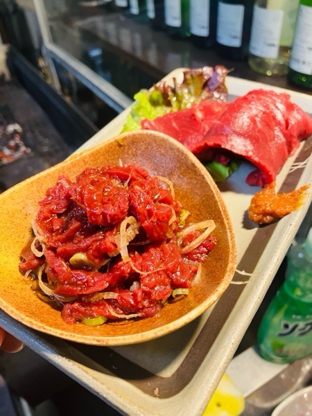 会津馬刺しと桜ユッケのハーフ&ハーフ。