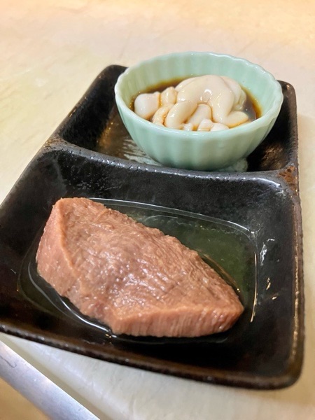 真鱈の白子ポン酢と牛タン煮が お通し。