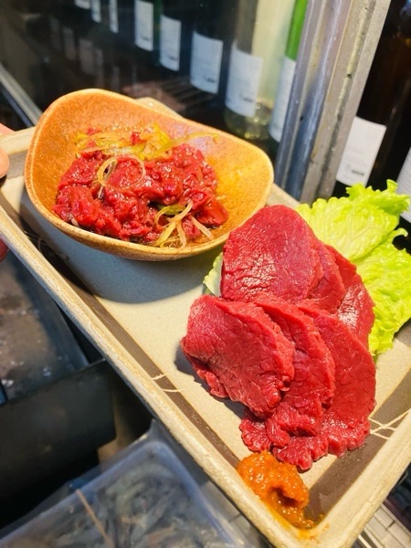 会津馬刺しと桜ユッケのハーフ&ハーフ。