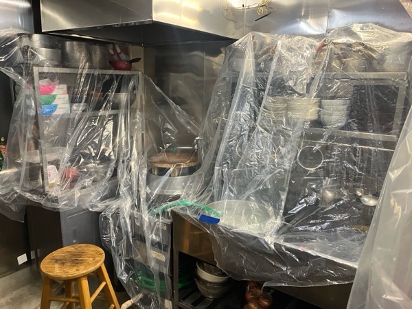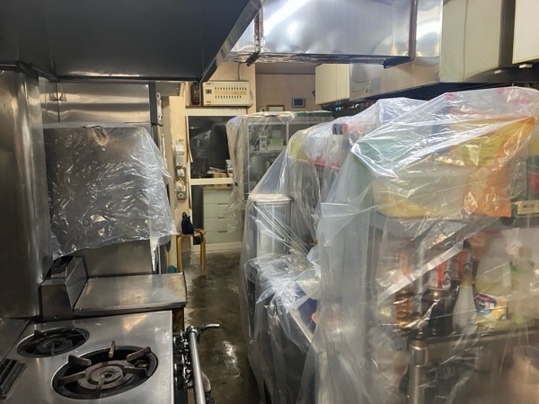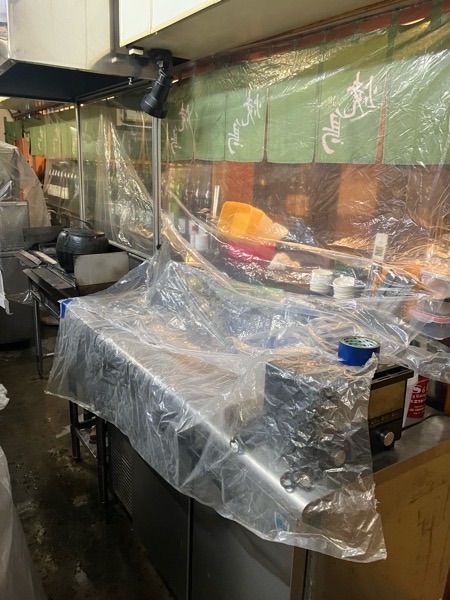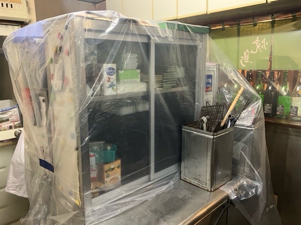 閉店しまして、お休みデー初日の恒例 煙突掃除に備えまして ビニールで色々と保護❗️