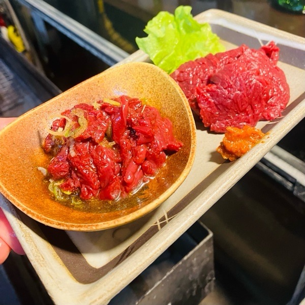 会津馬刺しと桜ユッケのハーフ&ハーフ。