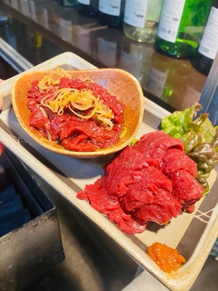 会津馬刺しと桜ユッケのハーフ&ハーフ。