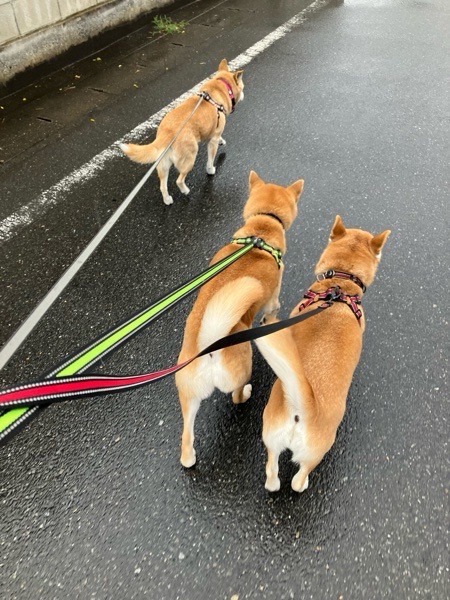 雨降りの中の お散歩でしたので、トリオ揃って 雨様ハーネスで、ひばりピンク・リリイエロー・みるレッド🤗