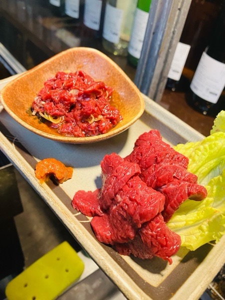会津馬刺しと桜ユッケのハーフ&ハーフ。